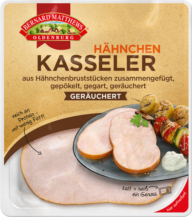 Proteinreich und fettarm unterstützt der Hähnchen-Kasseler von Bernard Matthews Oldenburg Ihre bewusste Ernährung! In Buchenholz geräuchert, erhält der Hähnchen-Kasseler seinen typischen Geschmack und macht ihn so zum idealen Begleiter für viele Gerichte. Egal ob als Snack für Zwischendurch oder als Protein-Beilage zum Salat, zum Gemüse oder als Bestandteil in einem Auflauf. Durch die einfache Zubereitung in der Pfanne ist der Hähnchen-Kasseler auch ideal, wenn es mal schneller gehen muss.
