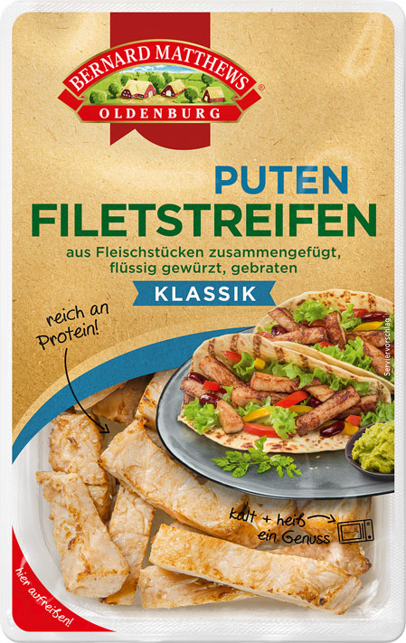 Unser Klassiker für den Salat, Wrap oder auch als Snack für Zwischendurch. Unsere Puten-Filetstreifen werden aus dem zarten Putenbrustfilet geschnitten und für Sie fertig gegart. Durch die einfache und schnelle Zubereitung in der Pfanne oder Mikrowelle werden unsere Puten-Filetstreifen, egal ob heiß oder kalt, zur idealen Beilage, wenn es mal schnell gehen muss. Weiter überzeugen unsere Puten-Filetstreifen durch ihren niedrigen Fettgehalt und sind gleichzeitig reich an Protein.